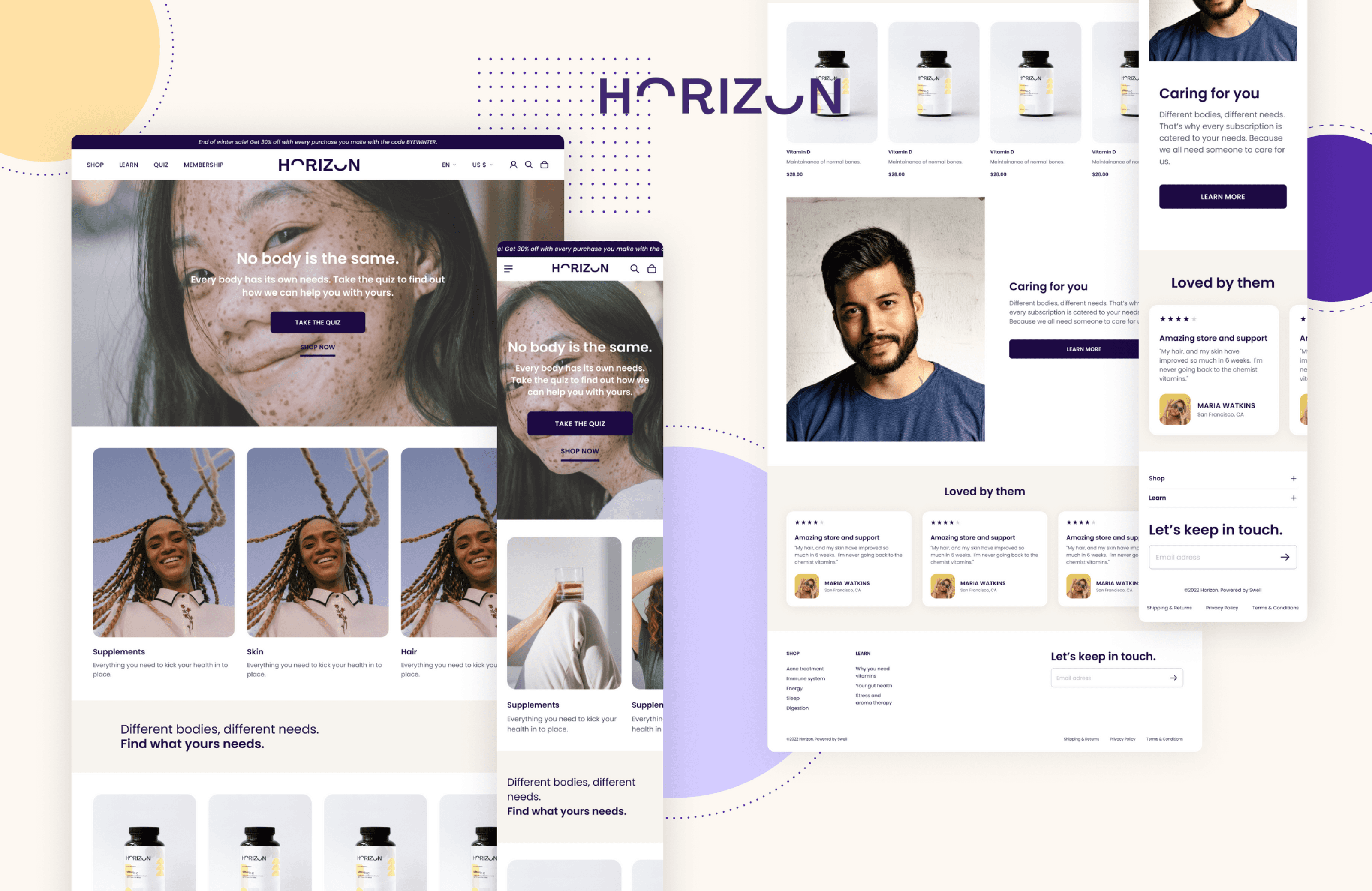 Horizon is an e-commerce theme developed to empower users to build and customize their online stores to suit their unique needs. With features like memberships, subscriptions, quiz functionalities, and all essentials for a robust online store, Horizon provides a versatile foundation. The complexity of this project lies in anticipating the wide array of ways users might want to personalize the theme. Balancing flexibility with practical limitations is essential—how much customization should be offered, and where should boundaries be set? Designing a theme involves creating an editor experience that’s simple yet adaptable, a task that required close collaboration between design, management, and development to ensure seamless functionality. This project was especially rewarding, offering the opportunity to shape Horizon from concept to completion. Building its branding, visual identity, and product functionality into one cohesive package involved developing an advanced Figma library—really, we had to rethink it multiple times,-reflecting the project’s scope and attention to detail.