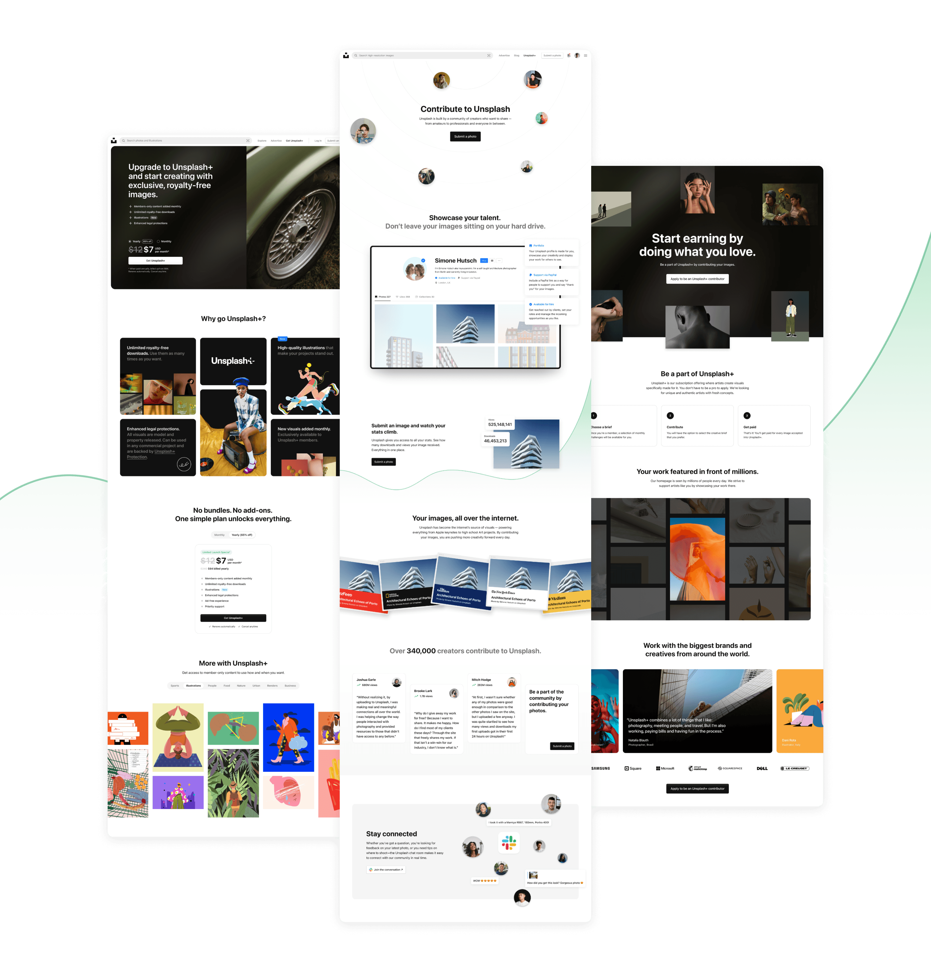 Marketing pages at Unsplash are really important at Unsplash, these pages play a critical role in Unsplash’s overall marketing strategy by showcasing premium features, driving subscriptions, and fostering a sense of community. Each design strikes a balance between delivering clear, concise information and maintaining Unsplash’s signature aesthetic.