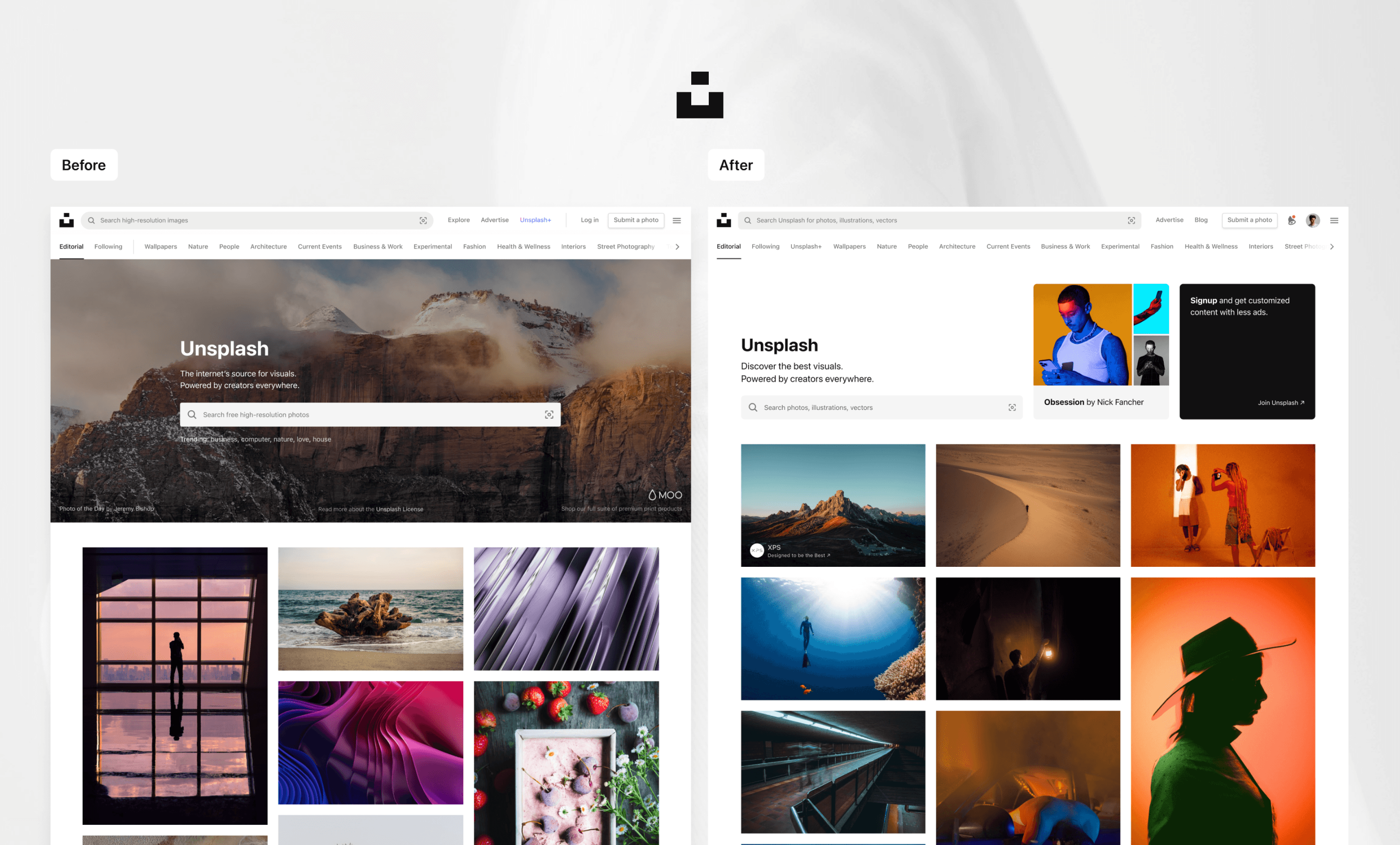 The Unsplash homepage had remained unchanged for years, but as the business priorities evolved, it was time for a fresh approach. Our first step was to categorise our diverse user base and analyse their behaviour—understanding where they clicked gave us valuable insights into what mattered most to them. The challenge was twofold: how could we cater to user needs and desires while also guiding them toward key business objectives? The feed grid, as the focal point of the homepage, needed to stay prominent. The question was: how do we present a wide variety of content in a way that encourages users to explore the platform beyond the homepage—without overwhelming the available page space?